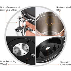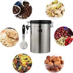 This coffee storage container using 304 edible grade stainless steel, so you safe and more secure.This coffee storage containers comes with a thoughtful design and an adjustable date tracking wheel above the coffee containers, so you can always check the storage date to know the storage time.This coffee storage airtight canister uses a one-way CO2 valve, which can release carbon dioxide inside the coffee storage container, thus effectively isolating, oxygen, water vapor into the coffee canister, preventing the food inside the coffee jar from getting wet.This airtight coffee container with a locking design, locking plus silicone ring can achieve a strong sealing effect.It can widely used for home use, coffee shops, beverage stores, can store coffee beans, tea leaves, nuts, etc.