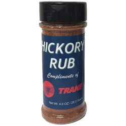 Hickory BBQ Rub, Great tasting smoky hickory taste. Used on all grilled meats. Comes in a plastic shaker with white or black cap. Great advertising space for outdoor bbq sponsors. Made in USA product. Manufacturers can use this as an incentive gift or reward. Great safety award item. Can be paired with other spices or BBQ sauce. Kitchen related companies can advertise on this product. Healthy food item, men and woman both love this item. Long lasting advertising source, and sales tool.