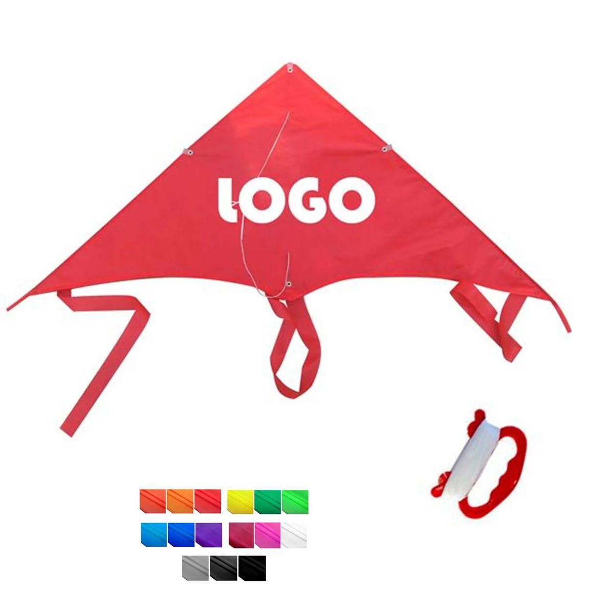 This kite is made of 190T polyester that's available in your choice of color. Features with fiberglass struts. The three end tails helps you guide the gliding kite through the air. 100' string and handle. Best toys and also a bright giving away item to carry your logo and name on it while any outdoor event.