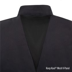 Key features include the Keep Kool mesh underarm, collar, and cuff system to enhance airflow and keep you fresh during high-heat situations. The black design with stylish gray contrasting stitching adds a modern, professional touch, making it a favorite for culinary professionals.