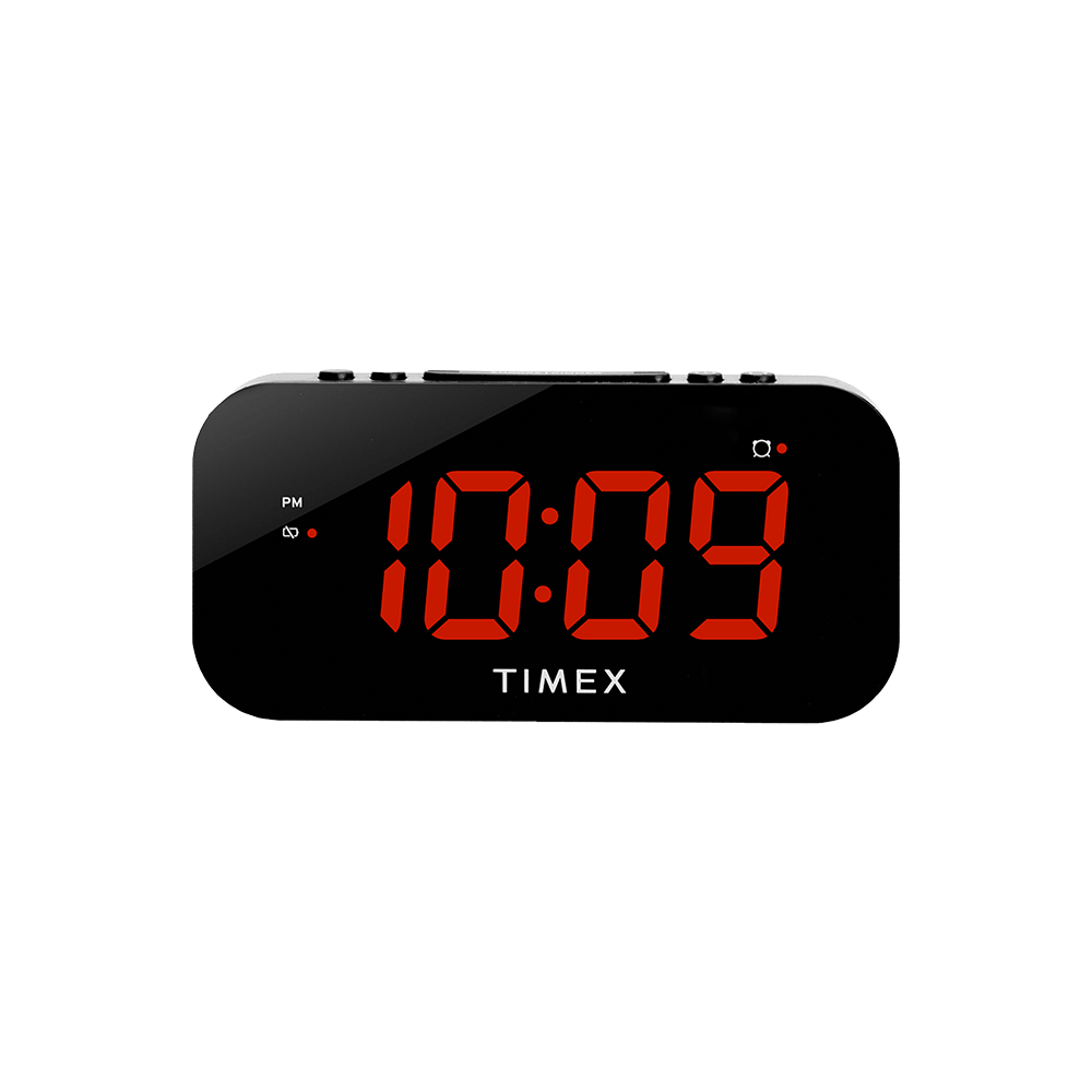 The Timex T1120B Bedside Alarm Clock has a variety of customizable settings that can be programmed in a few simple steps. A large 1.2” white LED display features an adjustable dimmer function, so you can choose the level of brightness to suit your room. Easily program your time and alarm settings, then wake to the built-in buzzer. Use the convenient ‘Set and Forget’ feature each time you wake - the alarm reset button will silence an alarm, and the clock will automatically set for the next day at the same time. Charge your devices while you sleep using the 5W USB-A charging port (cable not included). This small digital clock operates on a 100-240V universal power adapter, and the SureAlarm feature will maintain your alarm settings, even in the event of a temporary power failure. Includes T1