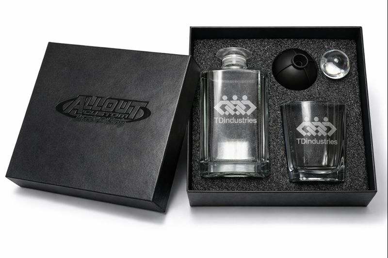 - This premium quality Whiskey Decanter set includes a10oz low ball glass, silicon ice ball mold and large Decanter put inside an engravable black leatherette Gift box
